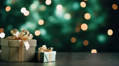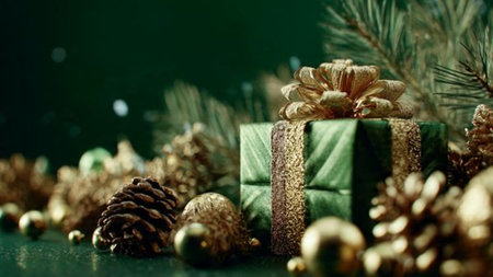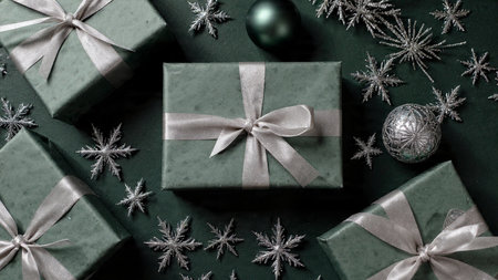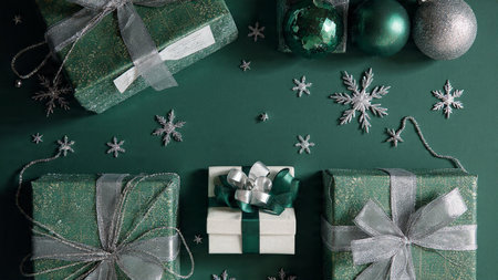 A smooth matte green surface bordered by premium wrapped presents and metallic silver ornaments.
