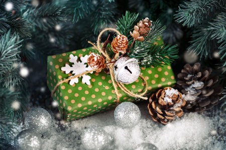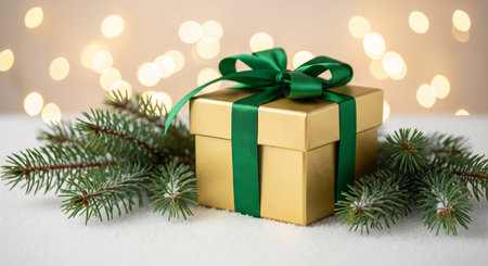 Golden gift box with green ribbon and spruce branch on snow, bokeh background. Christmas present concept for holiday and New year celebration..
