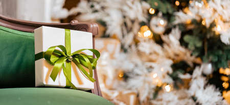 Holiday white gifts box with gold tape on background of Christmas tree bokeh, copy space