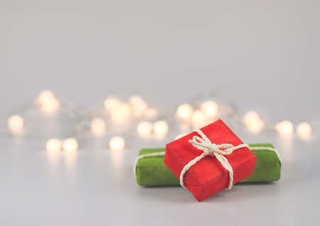 Front view of red and green gift box on white background with Christmas lights. Christmas holiday concept.
