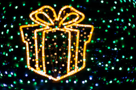 Bokeh yellow Christmas gift box with a large bow from color lights