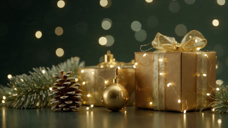 Soft-lit festive mockup combining subtle gold hues with deep emerald shadows.