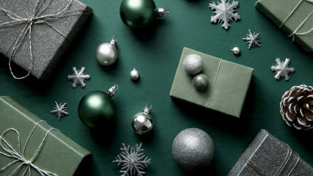 A smooth matte green backdrop framed by shiny silver baubles and minimal gift elements.