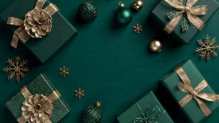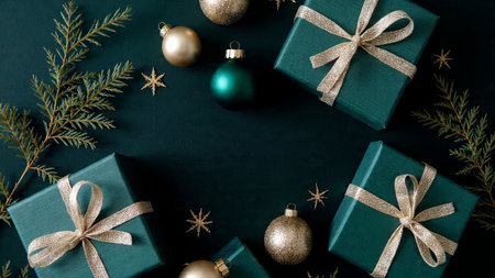 Sleek Christmas composition featuring balanced emerald motifs and premium gold decorative pieces.