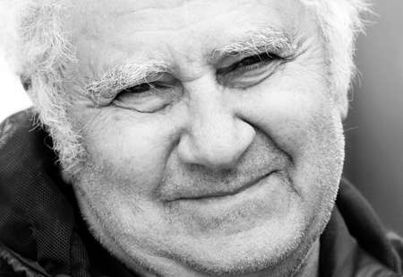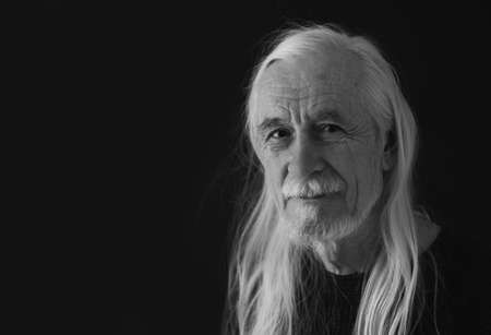 Low key studio black and white portrait of smiling attractive old man with loose long gray hair. Horizontally.