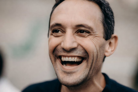 A smiling Caucasian man is looking at a photo of himself with opposite feeling