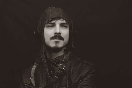Male portrait in retro style. young man in the vintage aviation suit on the black background