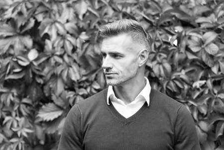 Creative male portrait. Handsome young man posing for the camera. Hipster, stylish men's hairstyle and strict look
