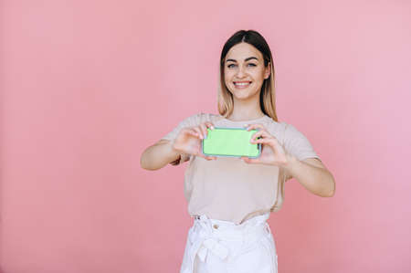 A girl with a smile holds a smart phone horizontally with a green screen on a pink background. Place for advertising or message. slogan