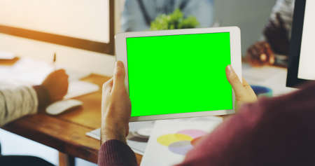 Time to get everyone talking about your business. Shot of an unrecognisable businessperson holding a digital tablet with a chroma key screen.
