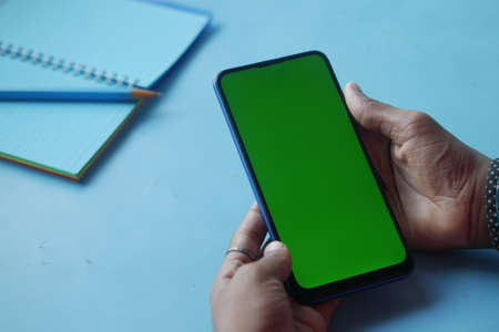 Male hand holding a smartphone with a green screen. Chroma key. Isolated on a blue background.