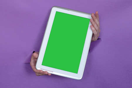 laptop with a green screen in your hands on a purple background, with a hand slot through the background.