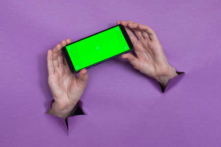phone with green screen in hand on purple background, hand gesture, through the background hand slot.