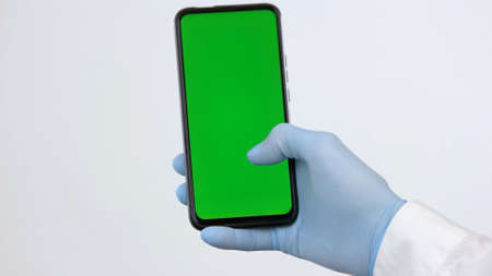 Phone with green screen for chromakey. Close-up hand with smartphone on white background.