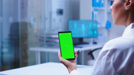 Young Female Doctor Holding Smartphone with Chroma Key Screen