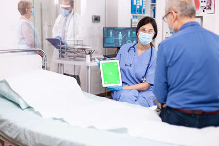 Nurse with face mask for protection against holding tablet with green mockup while consulting senior man. Medical examination for infections, disease and diagnosis.