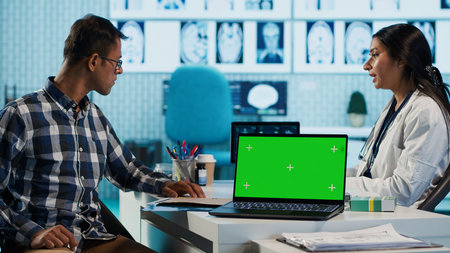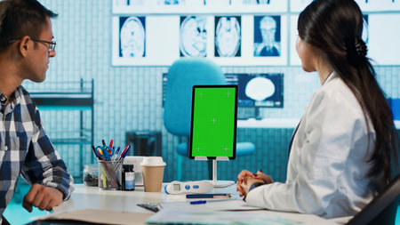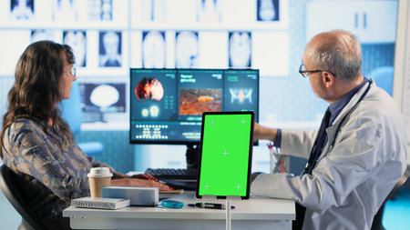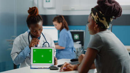 General practitioner and patient looking at greenscreen background on digital tablet in office. Isolated mockup template with blank copyspace and chroma key display at medical examination.