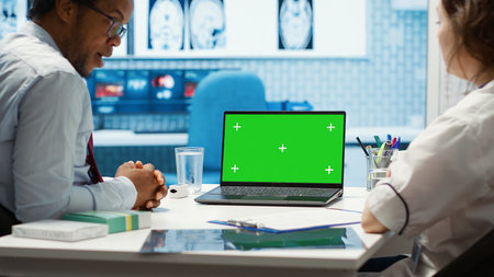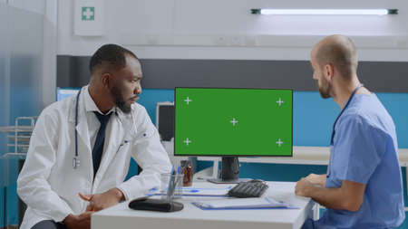 Mock up green screen chroma key computer with isolated display standing on table in hospital office. Multi-ethnic medical team discussing disease symptoms working at healthcare treatment