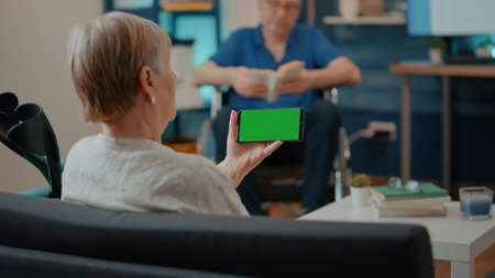 Mature woman holding horizontal green screen on smartphone, having physical disability. Senior person looking at isolated copy space template and chroma key mock up background on display.