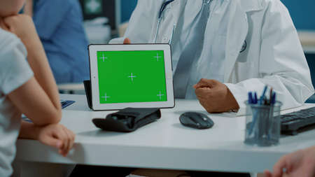 Doctor and patient looking at green screen on tablet for annual checkup visit. Medic holding modern gadget with isolated background and mockup template for chroma key on display.