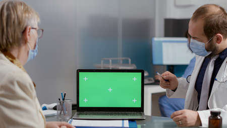 Elder person looking at greenscreen on laptop at checkup visit with medic during pandemic. Senior patient and doctor analyzing mockup copyspace with isolated chromakey template at examination.