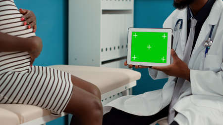 Medical specialist showing horizontal greenscreen on tablet to woman expecting child in cabinet. Doctor holding blank mockup template with isolated copyspace and chroma key display. Close up.