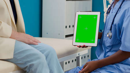 Medical nurse and patient looking at greenscreen on tablet, having appointment in cabinet. Specialist and elder woman analyzing blank chromakey display with isolated copyspace and mockup template.