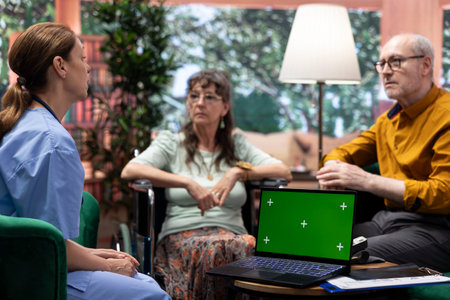 Caretaker offers professional advice to her elderly patients next to green screen on laptop, consulting senior couple during a home visit. Medical assistant provides support and medication.