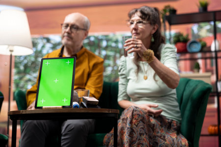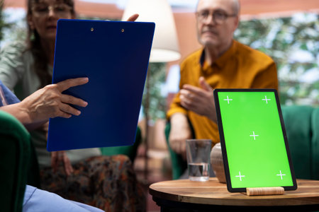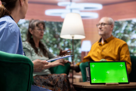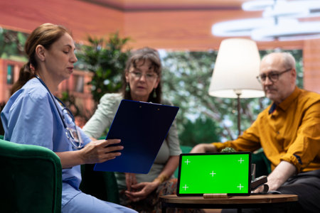 Caretaker offers professional advice to her elderly patients next to green screen on tablet, consulting senior couple during a home visit. Medical assistant provides support and medication.