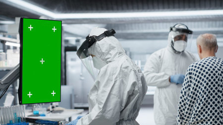 Medic looks at vertical green screen on monitor and observes patient reactions to antiviral treatment in a controlled laboratory setting. Vaccine development progress in prevention center. Camera B.