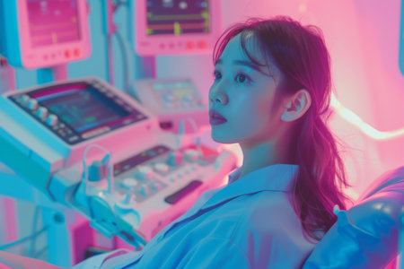 A serene woman in a hospital bed demonstrates relaxation and tranquility during her medical treatment, illuminated by soft, calming lights.