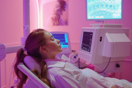 A woman is seated comfortably in a chair while undergoing a medical examination. She has electrodes attached to her body, connected to a device displaying her heart rate and other vital signs.