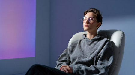 Relaxing in a modern wellness studio with soothing light therapy in the evening for stress relief and relaxation
