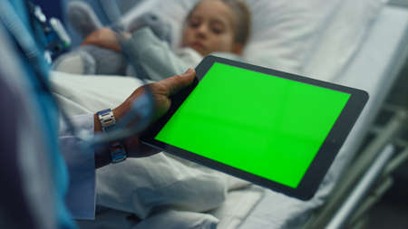 Doctor hand holding chroma key tablet computer device in hospital ward closeup. Unrecognized medical worker using green screen pad check health results. Sick girl lying with toy in clinic bed
