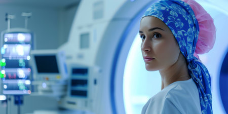 Woman With Cancer In Head Scarf Using Advanced Medical Technology In Hospital. Сoncept Cancer Treatment Advances, Supporting Cancer Patients, Medical Technology In Hospitals, Head Scarf Fashion.