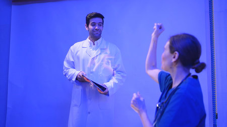 Doctors and medical professionals discuss preparing for physical and brain with futuristic hologram technology in a modern hospital setting