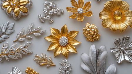 Discover an exquisite collection of vintage brooches featuring floral designs in golden and silver hues, perfect for jewelry enthusiasts and designers.