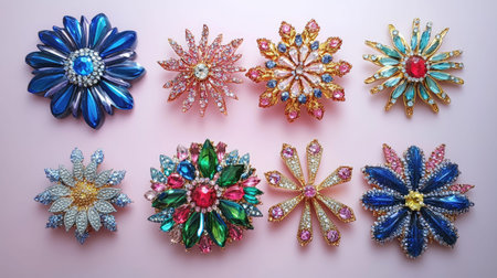 Explore a stunning collection of beautifully designed gemstone brooches arranged on a soft pink background. Perfect for fashion lovers looking for inspiration.