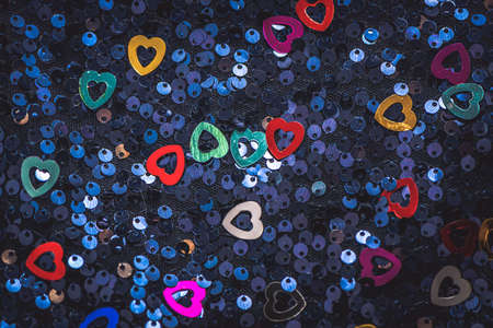 The background of the fabric is embroidered with shiny sequins with scattered slices of multicolored hearts