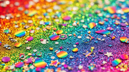 A detailed macro shot captures a surface of rainbow-colored glitter. Interspersed are various confetti shapes, including circles, stars, and uniquely shaped pieces that also feature the rainbow color spectrum. The shallow focus creates a soft bokeh, emphasizing the intricate textures and the vibrant, saturated hues. radiates a sense of fun, festivity, and creative expression.