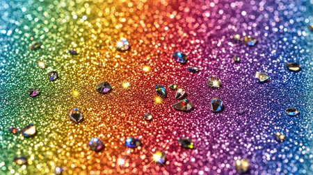 This macro captures a scattering of small, faceted crystals and rhinestones resting on a vivid rainbow glitter background. The glitter provides a richly textured and sparkling surface that a gradient of colors from red to purple. The tiny gems catch the light, creating bright highlights and subtle reflections. Starburst light effects add a touch of magic and sparkle to the scene. The shallow depth of field focuses on the gems and the immediate glitter texture, creating an abstract and...
