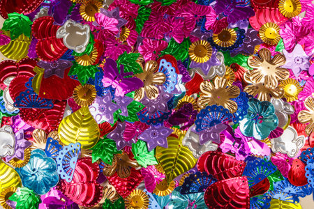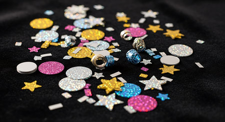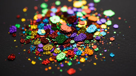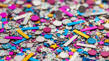 A dazzling arrangement of colorful glitter and shimmering sequins creates a vibrant and festive atmosphere, perfect for celebrations and artistic expressions.