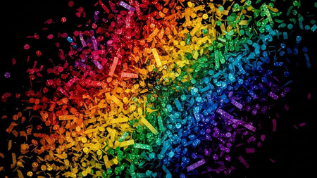 A dynamic explosion of rainbow-colored confetti and glittering particles bursts against a stark black background, creating a vibrant and festive visual.