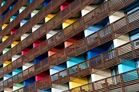 A vertical shot of a building facade with patterned colorful doors and balconies