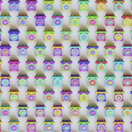 Overhead perspective on a perfect grid of vibrant, multicolored retro handsets on a white surface. This image is a 3d render.