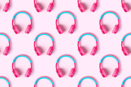 Seamless pattern of pink and light blue headphones on pink background. Minimalistic fashion music concept. Top view, flat lay