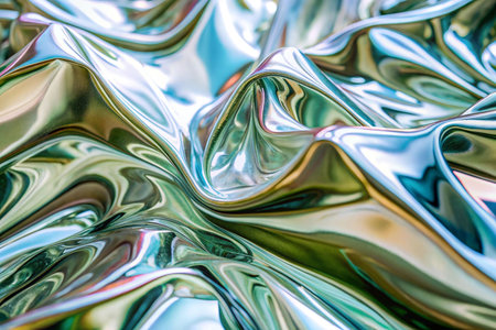 A close-up view of a shimmering metallic fabric, showcasing delicate smooth waves and reflective surfaces that create a vibrant, modern aesthetic.