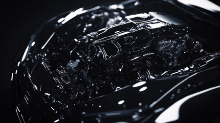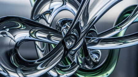 This stunning composition features abstract curved glass shapes reflecting light on a shiny metallic surface, creating intricate visual patterns and depth.