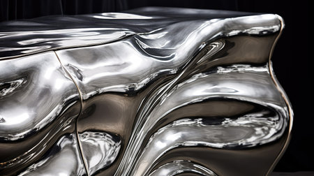 Wavy metallic surfaces create mesmerizing reflections under gentle lighting, showing a dynamic interplay of shapes and highlights. The undulating texture invites viewers to explore its smooth, fluid form.
