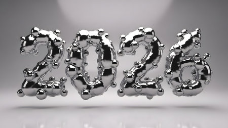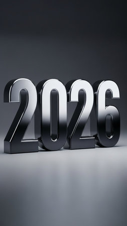 Polished metal numbers 2026 are rendered with a layered, reflective design. Clear details and vib...